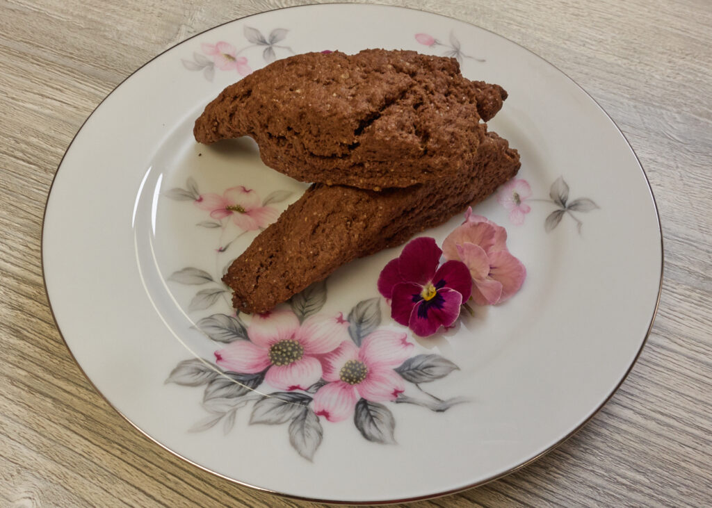 In a large mixing bowl, combine flour, cocoa, sugar, and baking powder. Cut in the cold butter until the mixture resembles coarse crumbs and there are no large chunks of butter remaining. Add melted chocolate, cream, vanilla, and egg mixing until combined. Bake at 425 F for 10-12 minutes. Enjoy!