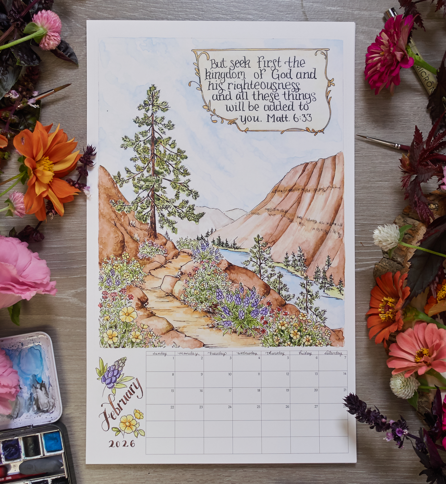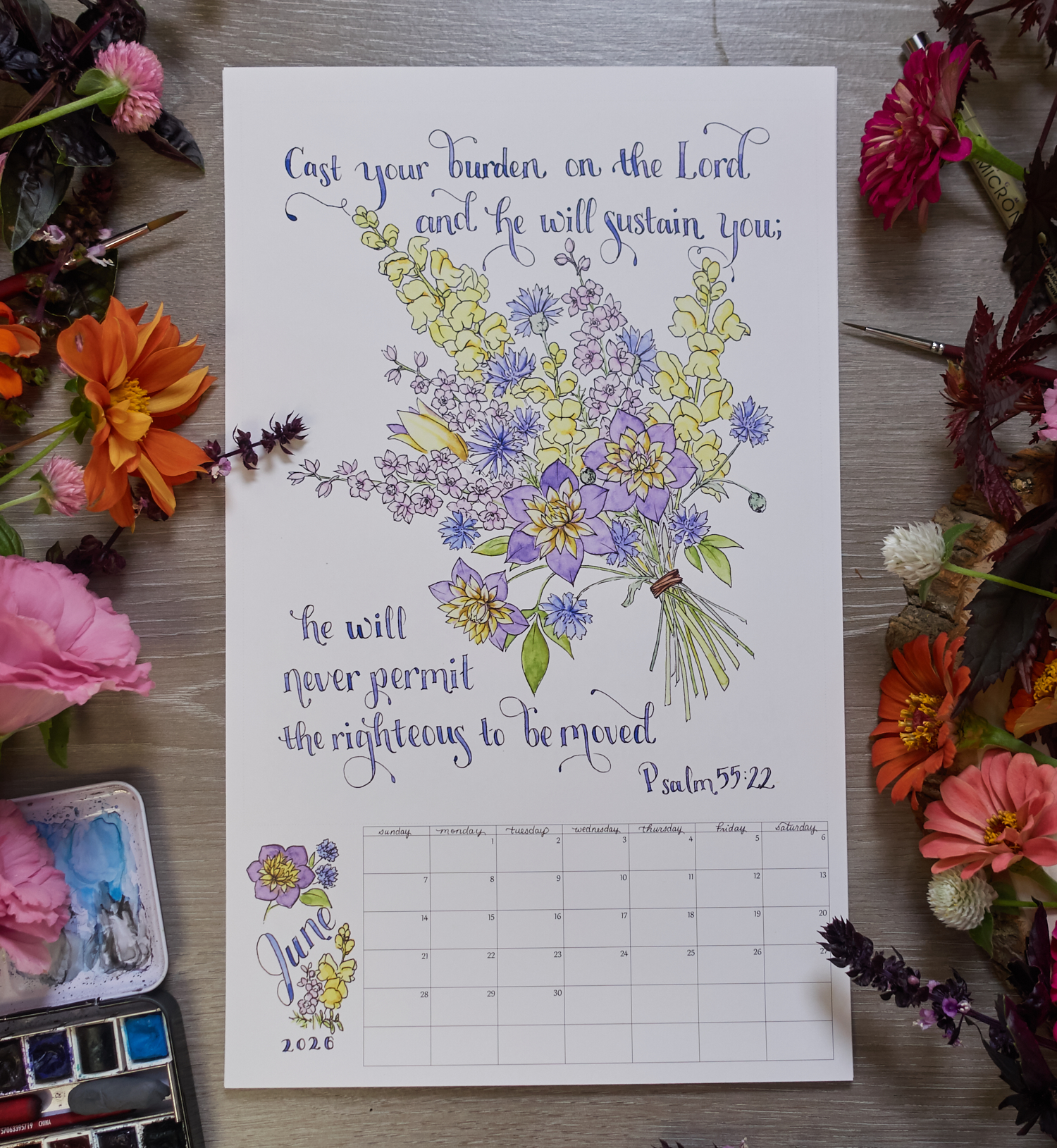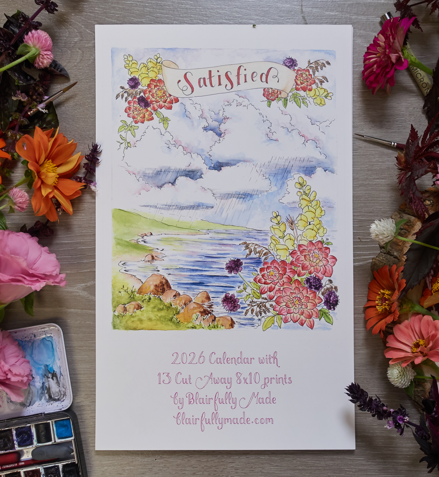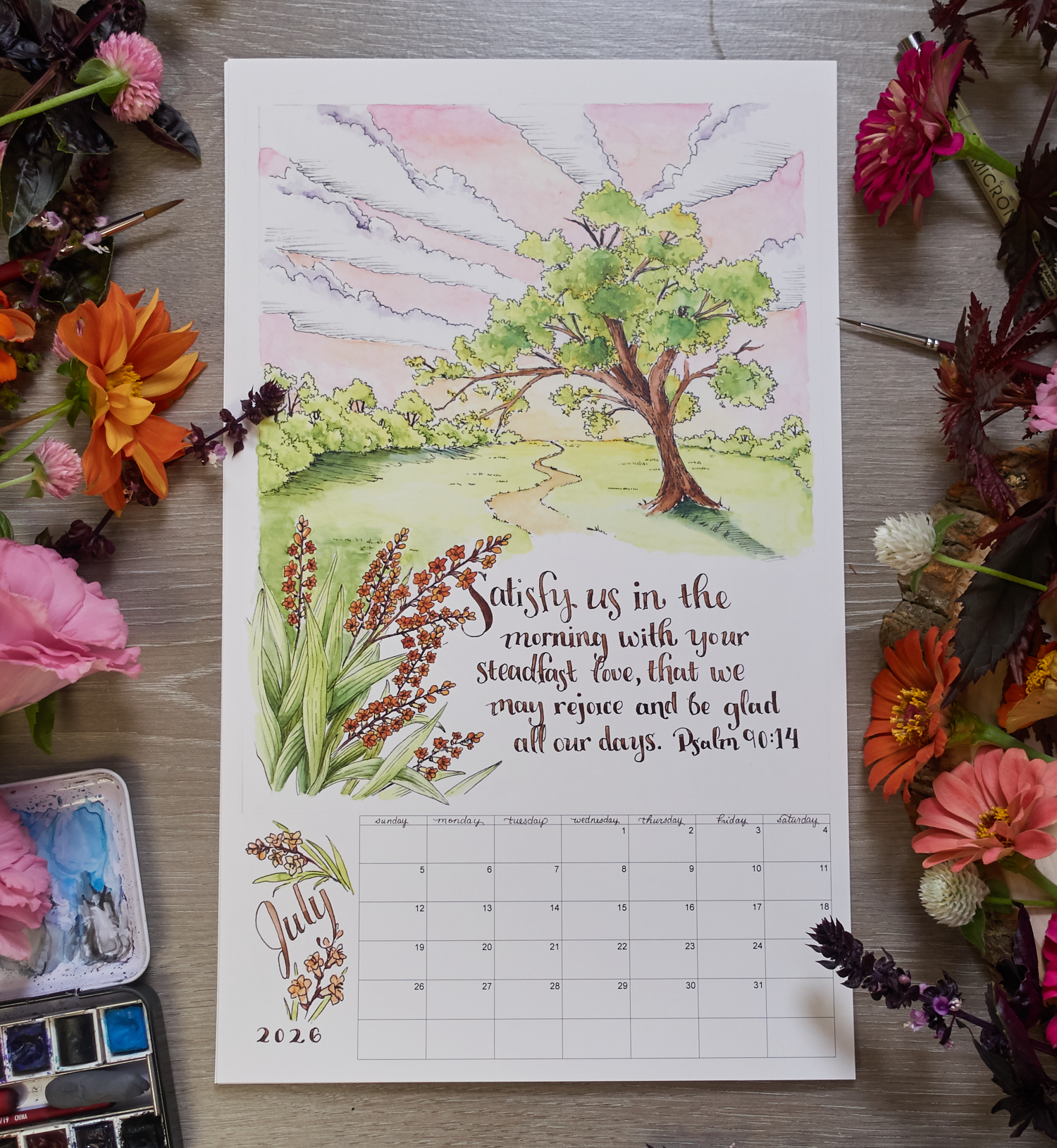 The 2026 calendar’s theme is “Satisfied”. The calendar is filled with verses to remind us that contentment and satisfaction are found only in God. Each month is colorfully illustrated with Blair’s original artwork to adorn and accentuate these verses. Designed for legal sized paper (8.5″ x 14″), this downloadable calendar contains a .zip file of 13 images for you to print. (For personal use only, please do not sell copies. Thanks!)