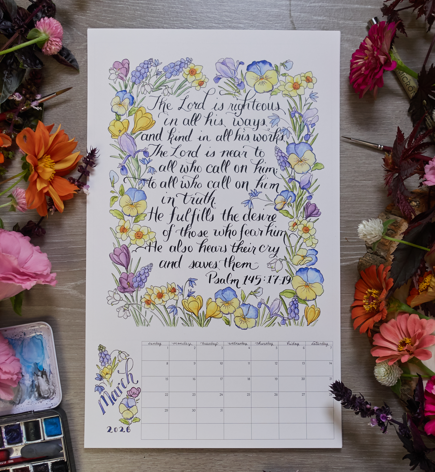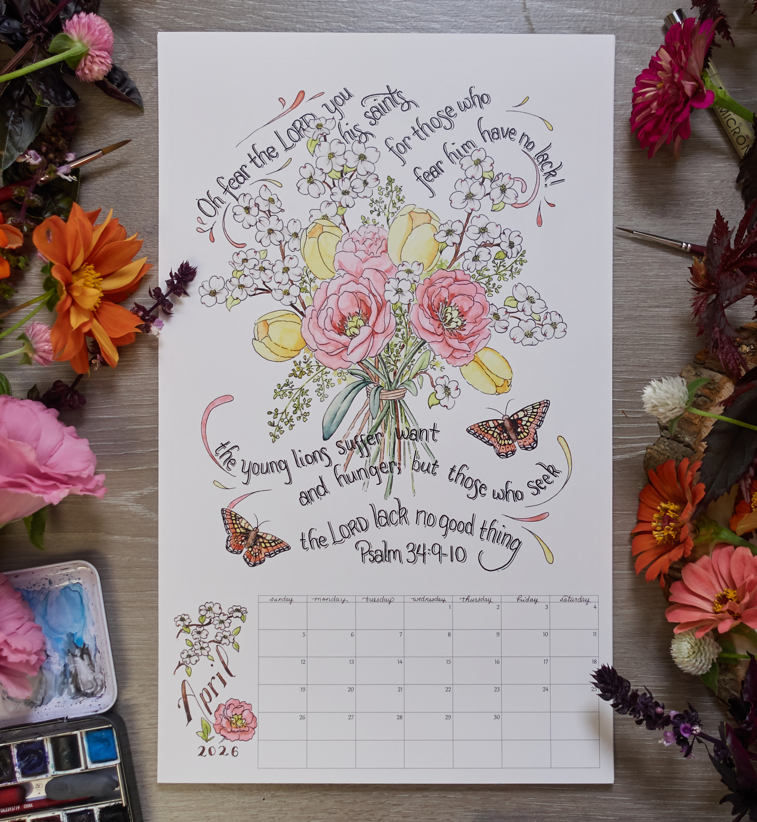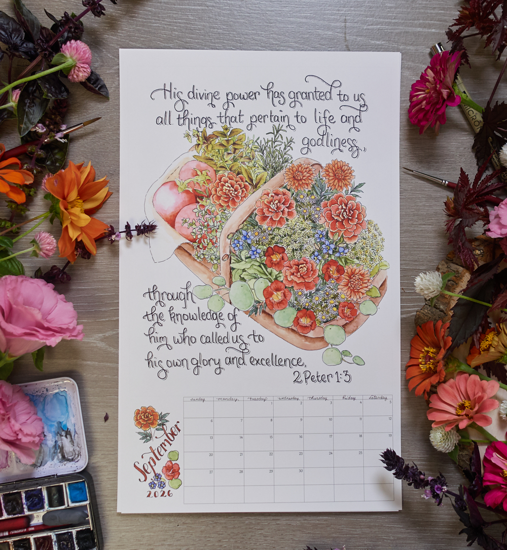 The 2026 calendar’s theme is “Satisfied”. The calendar is filled with verses to remind us that contentment and satisfaction are found only in God. Each month is colorfully illustrated with Blair’s original artwork to adorn and accentuate these verses. Designed for legal sized paper (8.5″ x 14″), this downloadable calendar contains a .zip file of 13 images for you to print. (For personal use only, please do not sell copies. Thanks!)