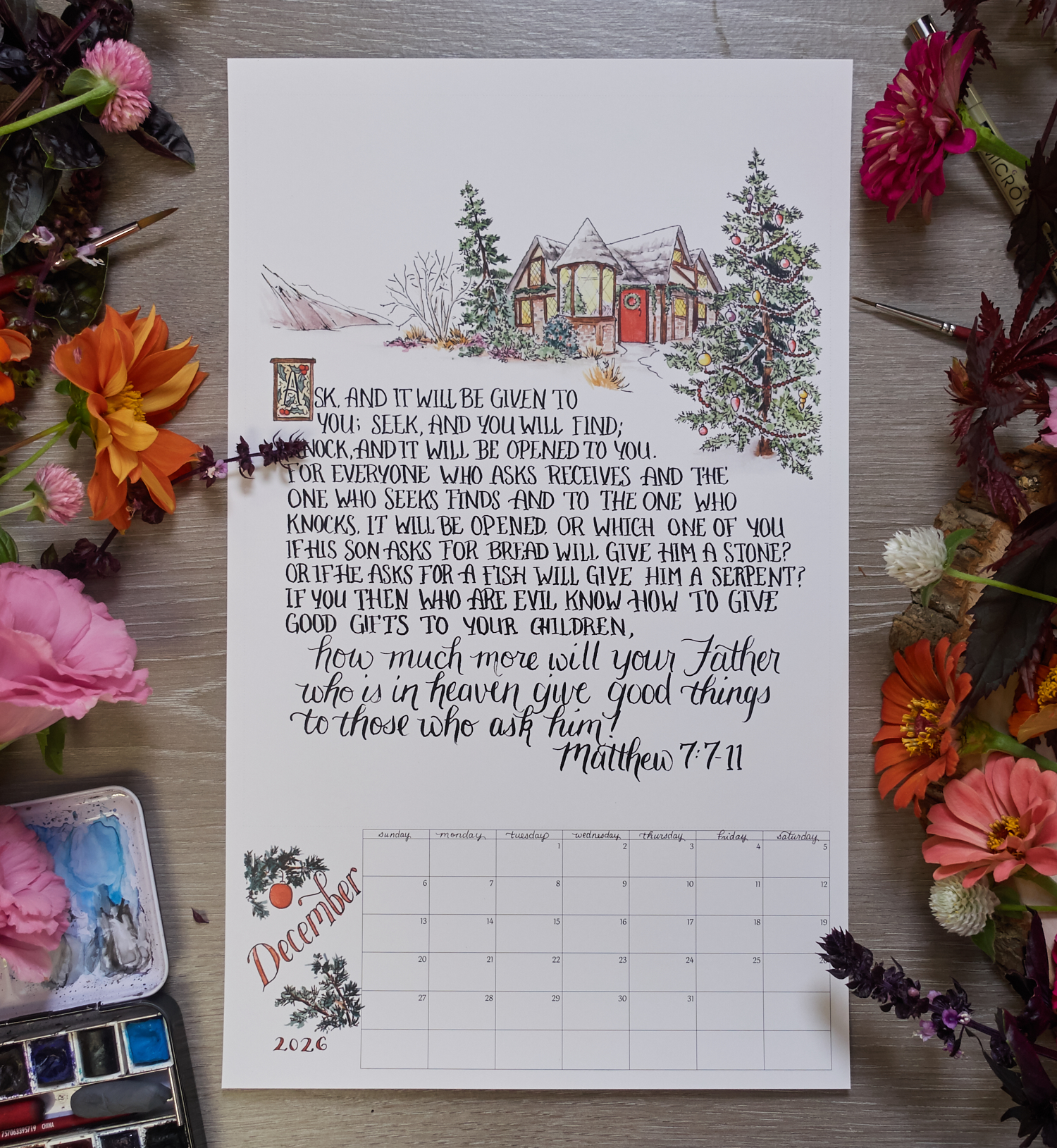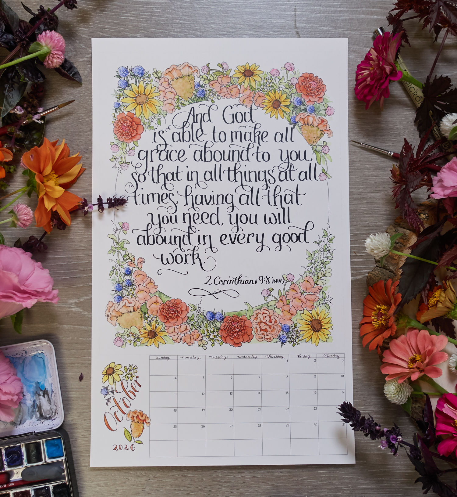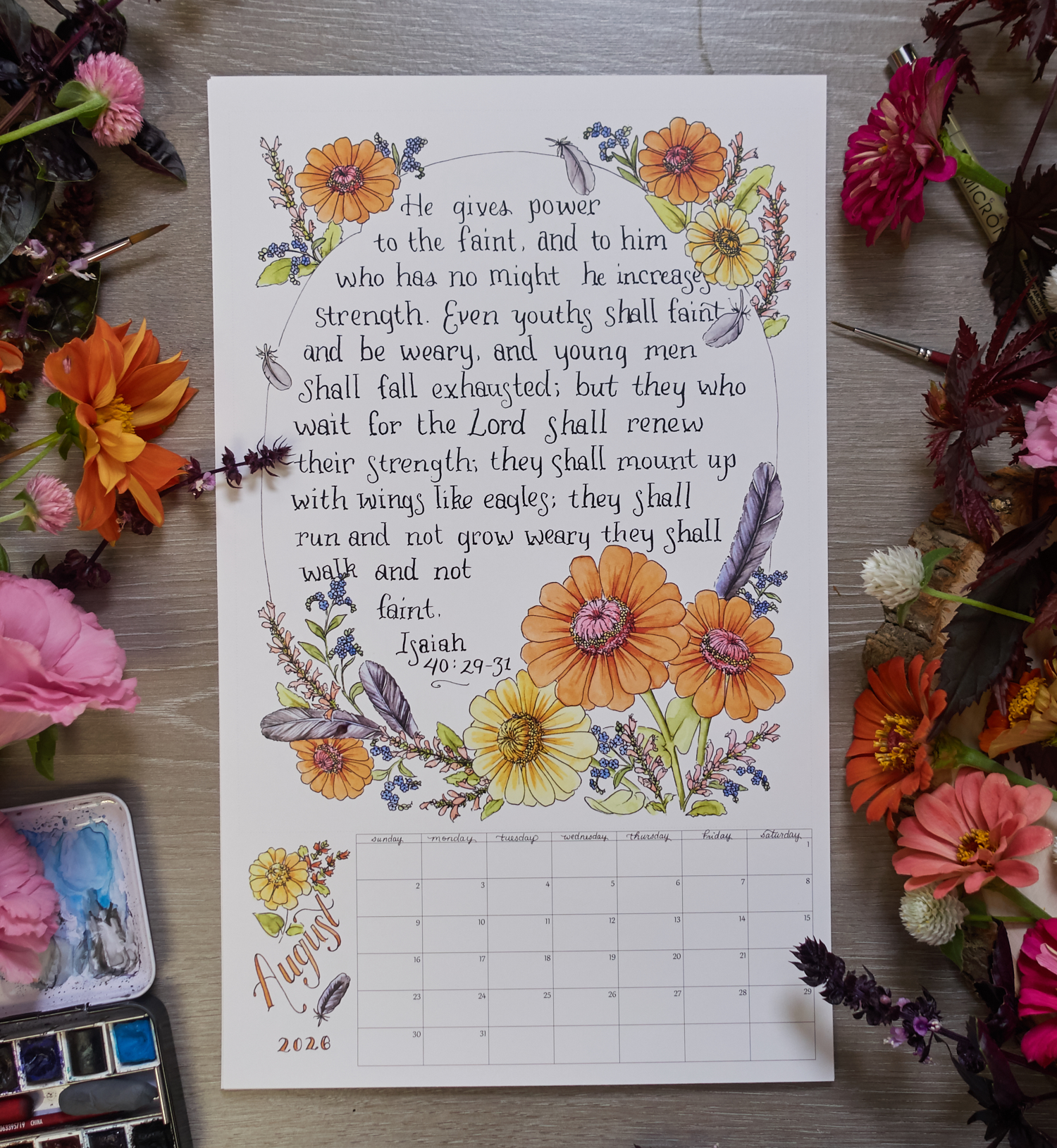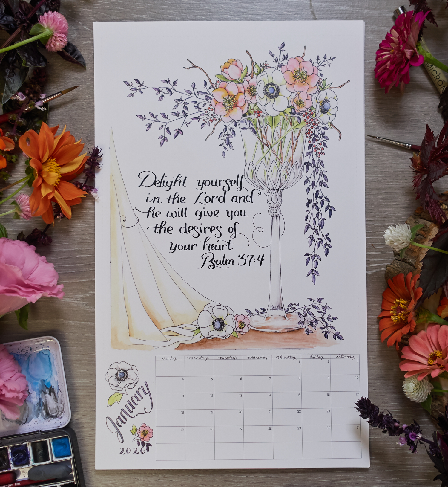 The 2026 calendar’s theme is “Satisfied”. The calendar is filled with verses to remind us that contentment and satisfaction are found only in God. Each month is colorfully illustrated with Blair’s original artwork to adorn and accentuate these verses. Designed for legal sized paper (8.5″ x 14″), this downloadable calendar contains a .zip file of 13 images for you to print. (For personal use only, please do not sell copies. Thanks!)